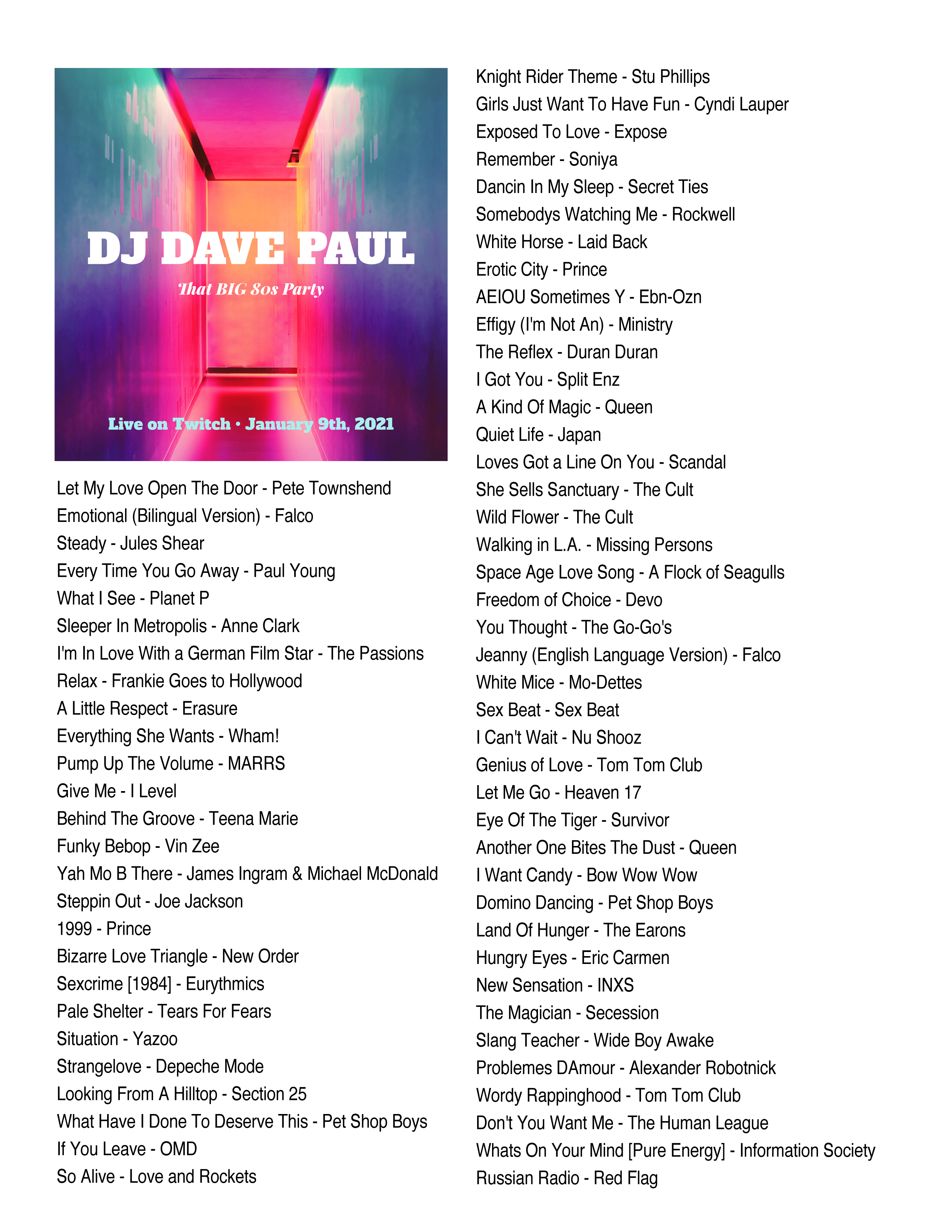Step back in time and relive the iconic sounds of the 1980s with “Open The Door to the 80s”, a live DJ set by DJ Dave Paul. From synth-pop and new wave to classic rock and soulful hits, this mix takes you through the decade that defined a generation.